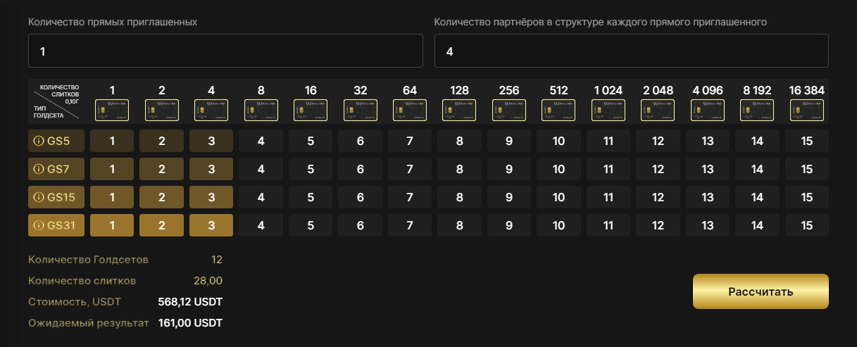 Калькулятор работает из расчёта одинаковых сумм активаций голдсетов всеми указанными партнёрами вашей структуры. Если сумма вашей активации 1000 USDT, то и расчёт будет производиться из расчёта 1000 USDT каждым указанным вами участником программы.
